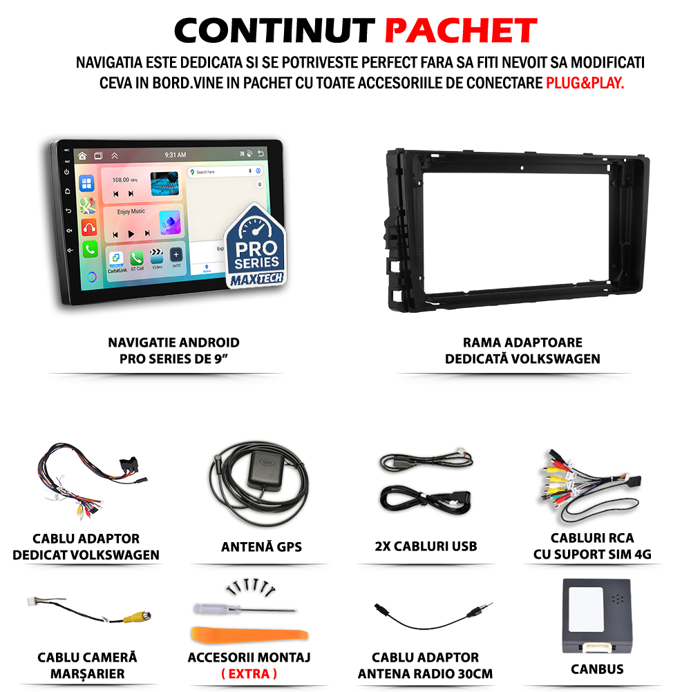 Navigatie Volkswagen Polo, T-Roc, Transporter, California (2015-2025) dedicata, MaxTech® PRO SERIES, 8 GB Ram 128 GB Rom OctaCore, Carplay & Android auto, Ecran 9” HD Touch, SIM 4G, GPS, Wifi