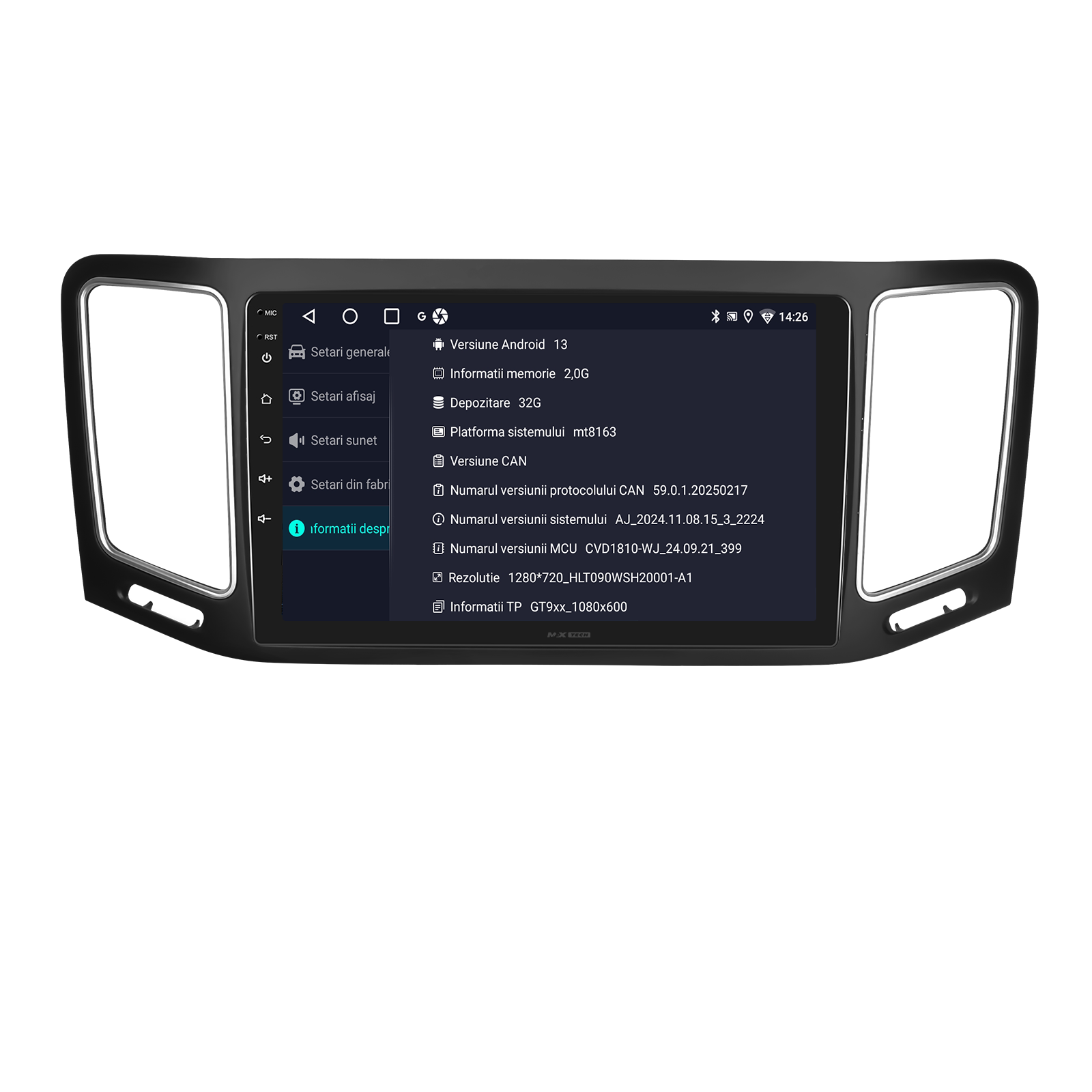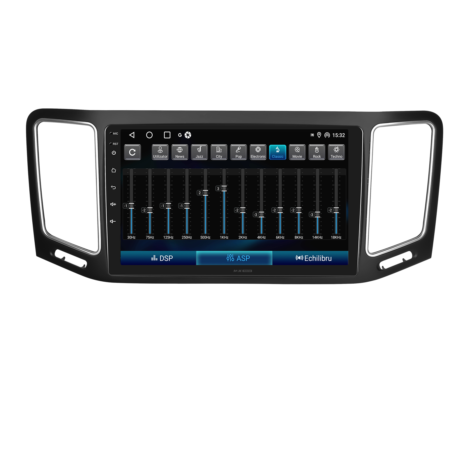 Sistemul include radio RDS cu afisare post si melodie, comutare automata pe frecventa cea mai buna si procesare audio DSP cu egalizator si filtru activ pentru sunet clar, echilibrat si personalizabil.