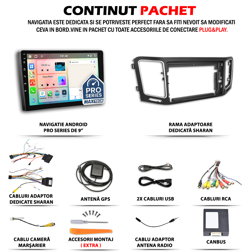 - Inainte de montaj, este esential ca toate componentele incluse in pachet sa fie verificate cu atentie. Conectorii trebuie sa corespunda cu cei ai vehiculului, iar eventualele module CANBUS, adaptoarele pentru comenzile de pe volan sau extensiile auxiliare (USB, RCA etc.) trebuie instalate conform specificatiilor tehnice.