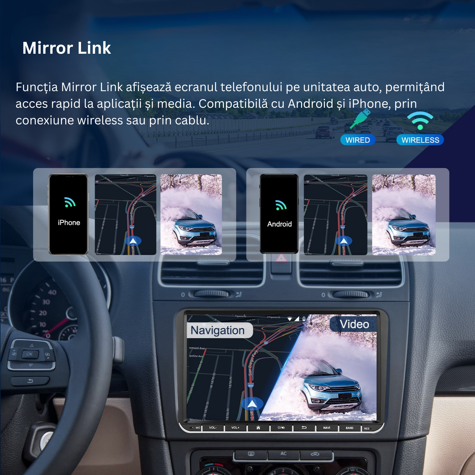 Conectare in oglinda (Mirror Link) – Reda ecranul telefonului direct pe display-ul navigatiei pentru acces rapid la continut.