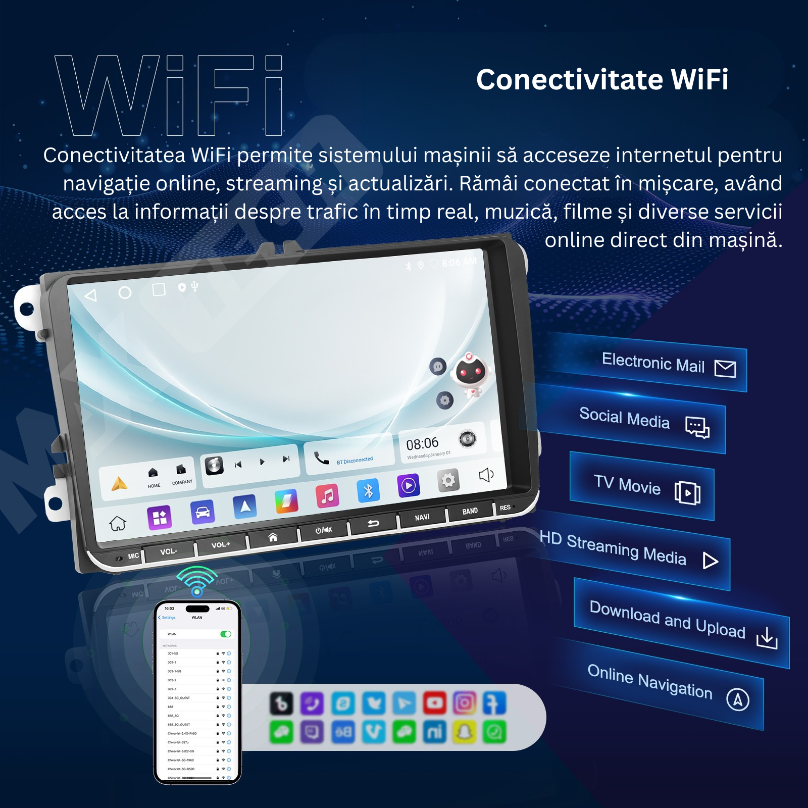 WiFi integrat – acces la internet, YouTube, TikTok, Waze etc.