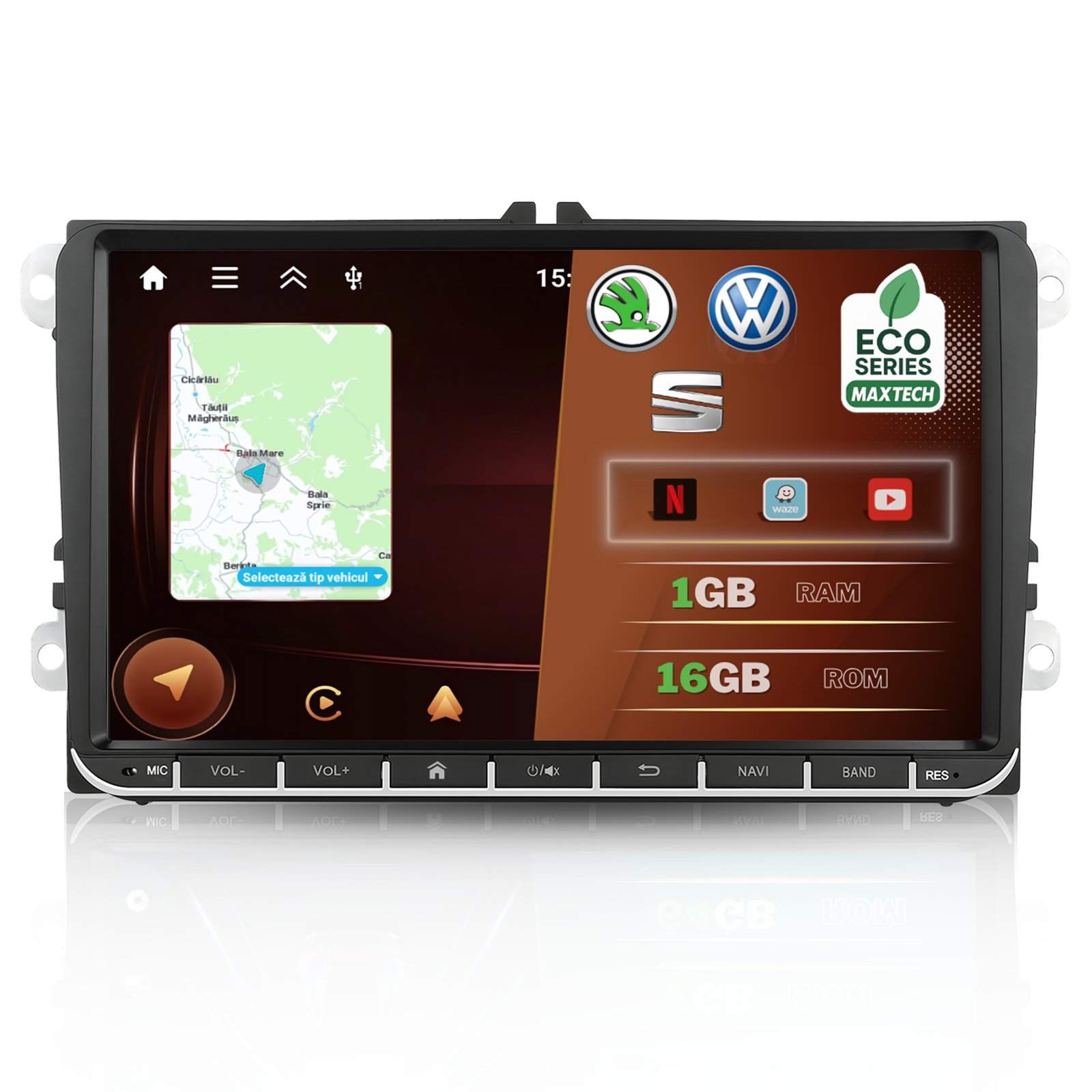 Navigatie Volkswagen / Skoda / Seat dedicata cu Carplay, MaxTech® ECO SERIES, Android 10 , Ecran 9” HD, Mirrorlink, Wifi, GPS, Radio, Bluetooth, Waze, Touran, Golf, Passat, Jetta, Octavia, Polo