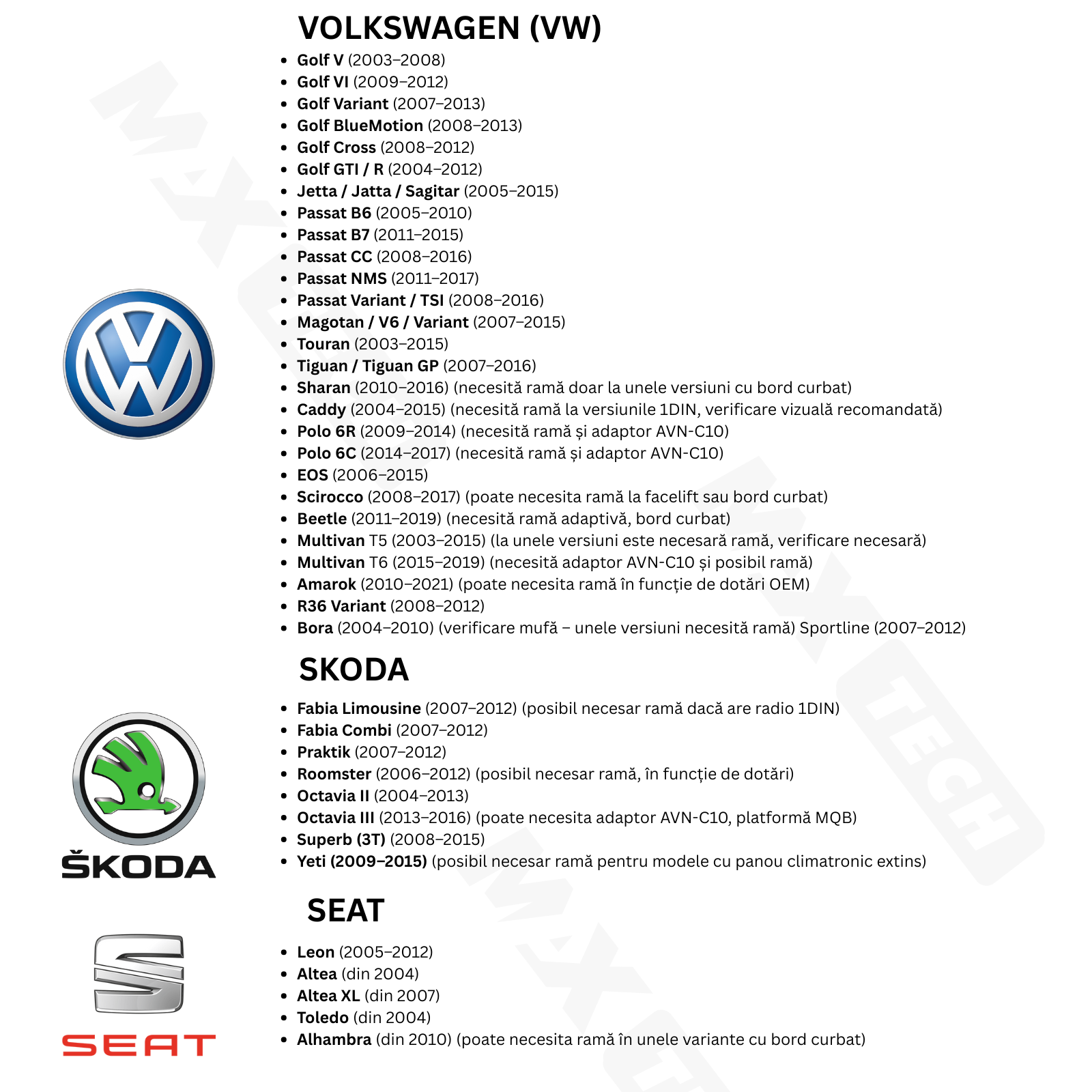 - Caddy (2004–2015) (necesita rama la versiunile 1DIN, verificare vizuala recomandata)