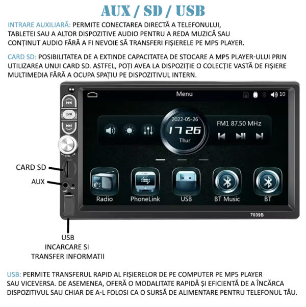 - Redare directa: Faptul ca poti reda fisiere direct de pe un card SD sau de pe un dispozitiv conectat prin cablu auxiliar face ca MP5 player-ul sa fie extrem de versatil, potrivit pentru o varietate de scenarii, de la ascultarea muzicii in masina, pana la vizionarea filmelor sau videoclipurilor in timpul calatoriilor.