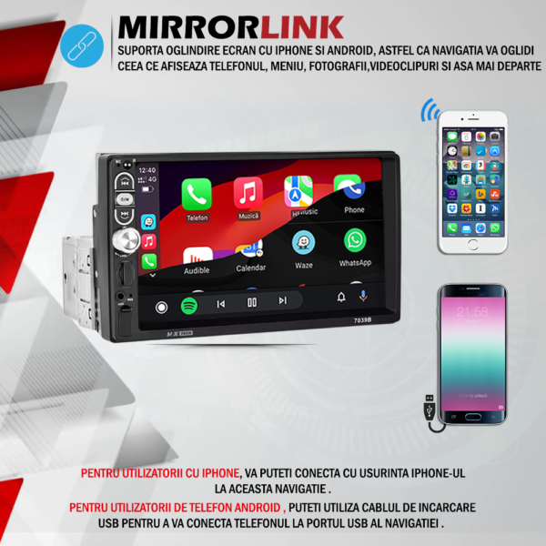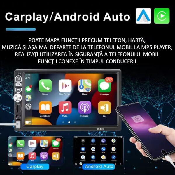 - Integrare perfecta cu iPhone-ul tau: CarPlay permite o conectare rapida si simpla a iPhone-ului tau la Mp5 Player, oferindu-ti acces instantaneu la aplicatiile tale preferate direct pe ecranul masinii.