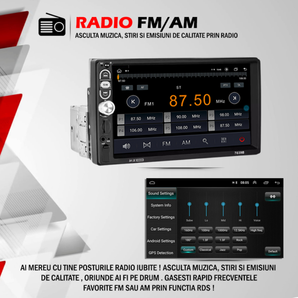 - Radio FM cu Egalizator DSP: Bucura-te de posturile tale preferate de radio cu o calitate superioara a sunetului, personalizata prin egalizatorul DSP pentru o experienta audio optimizata.