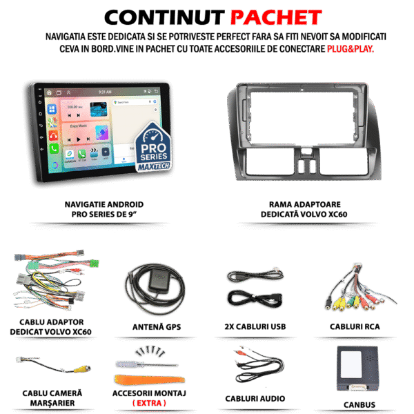 Navigatie VOLVO XC60 2008-2013 dedicata, MaxTech® PRO SERIES, 2 GB Ram 32 GB Rom, Carplay & Android auto, Ecran 9 ” HD Touch, GPS, Wifi, Bluetooth, Radio, USB, EQ, DSP, Waze, Youtube