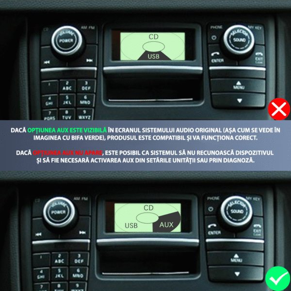 Aceasta navigatie este compatibila doar cu sistemele audio care au optiunea AUX activa.