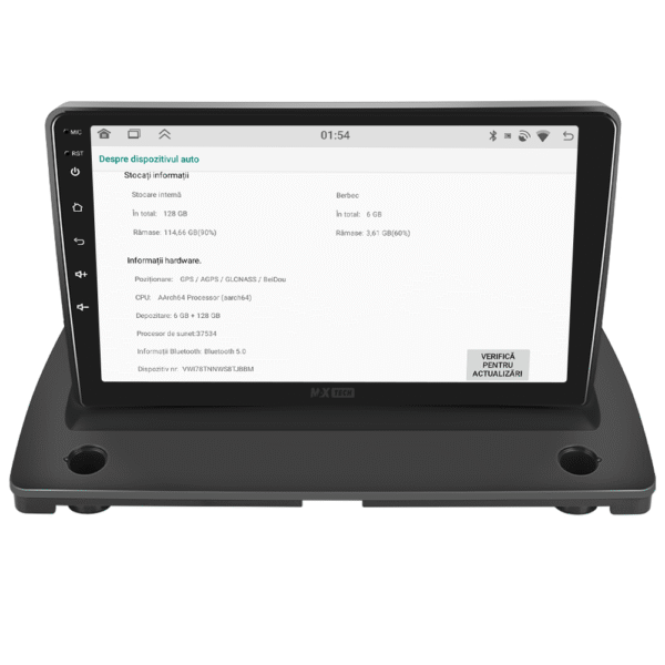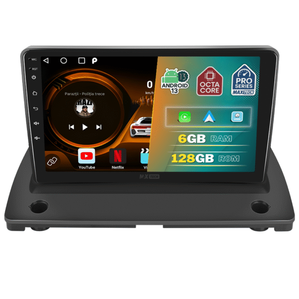 Sistemul MaxTech Pro Series este echipat cu un procesor OctaCore de tip 4+4, 6 GB RAM si 128 GB stocare, pentru multitasking rapid. Ecranul IPS HD de 1280×720 ofera culori reale si vizibilitate excelenta din orice unghi, cu design modern 2.5D.