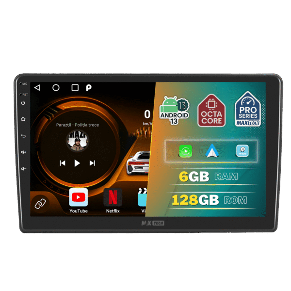 Sistemul MaxTech Pro Series este echipat cu un procesor OctaCore de tip 4+4, 6 GB RAM si 128 GB stocare, pentru multitasking rapid. Ecranul IPS HD de 1280×720 ofera culori reale si vizibilitate excelenta din orice unghi, cu design modern 2.5D.