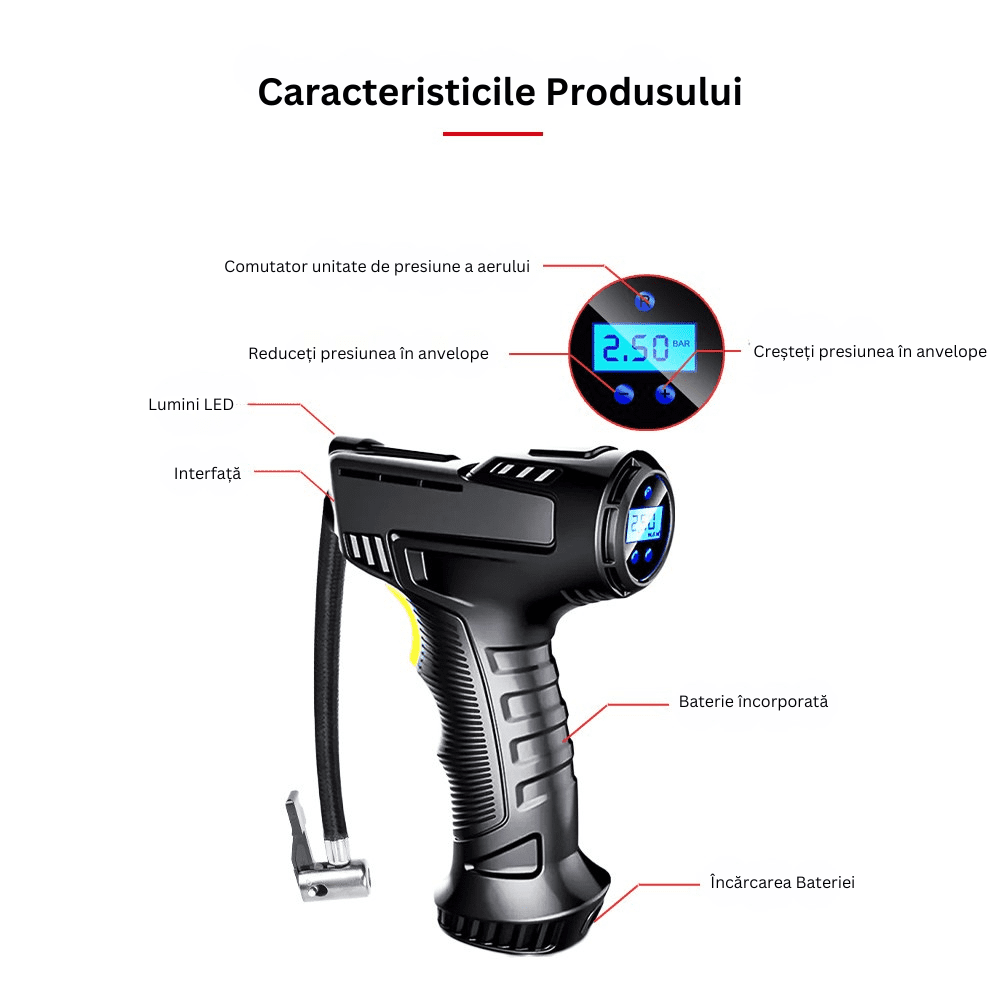 Aceste caracteristici ofera o gama completa de functionalitati pentru un compresor de aer portabil, asigurandu-se ca poate fi utilizat in multiple situatii si oferind utilizatorului confort si siguranta.