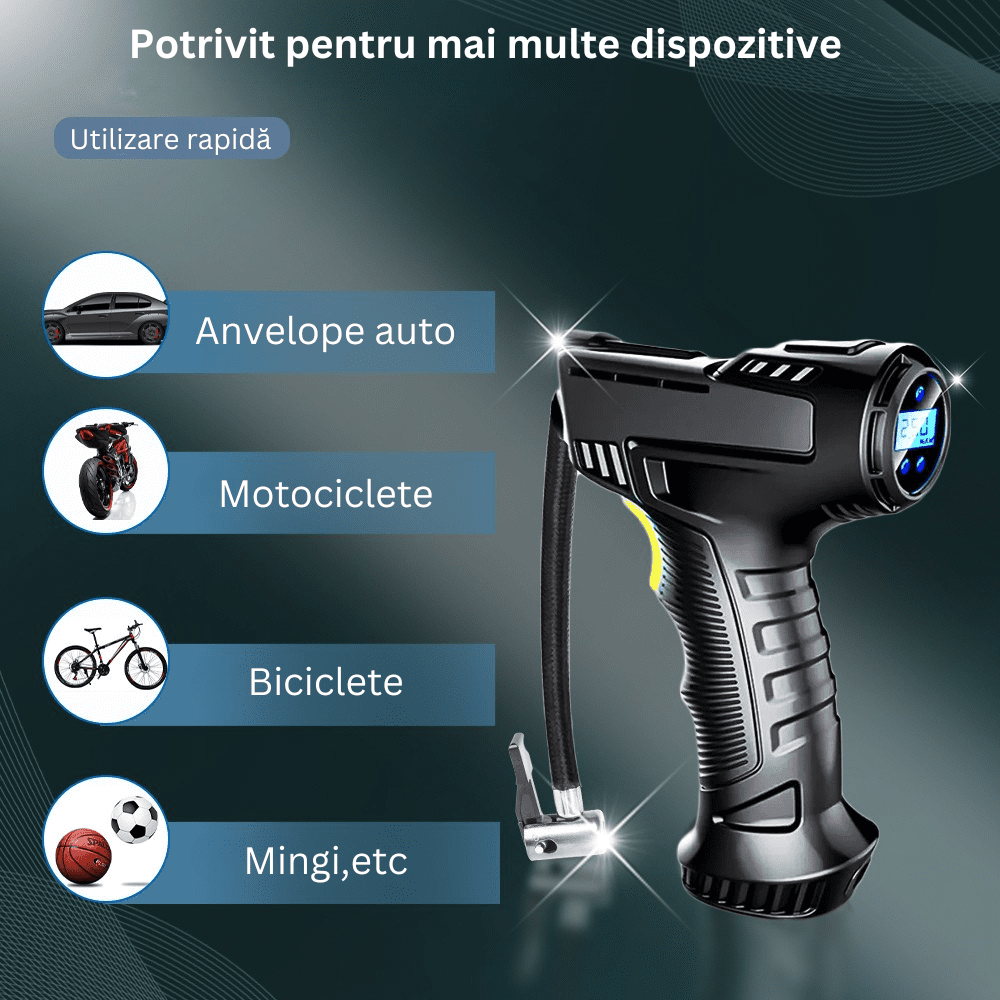 Pompare rapida: Capabilitatea de a umfla rapid rotile sau alte obiecte, cu o viteza de pompare de 20-35 L/min (aproape 10-15 minute pentru o roata auto complet goala, in functie de marimea acesteia).