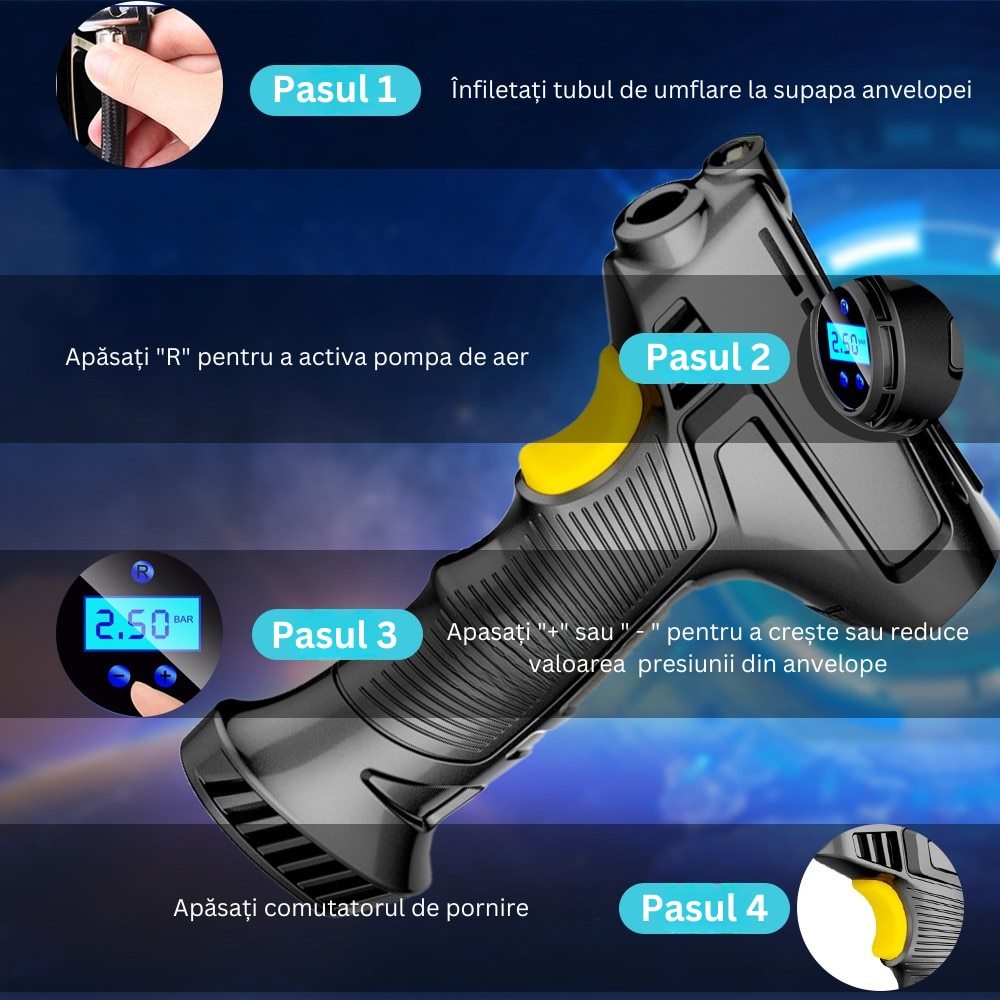 Aceste caracteristici ofera o gama completa de functionalitati pentru un compresor de aer portabil, asigurandu-se ca poate fi utilizat in multiple situatii si oferind utilizatorului confort si siguranta.