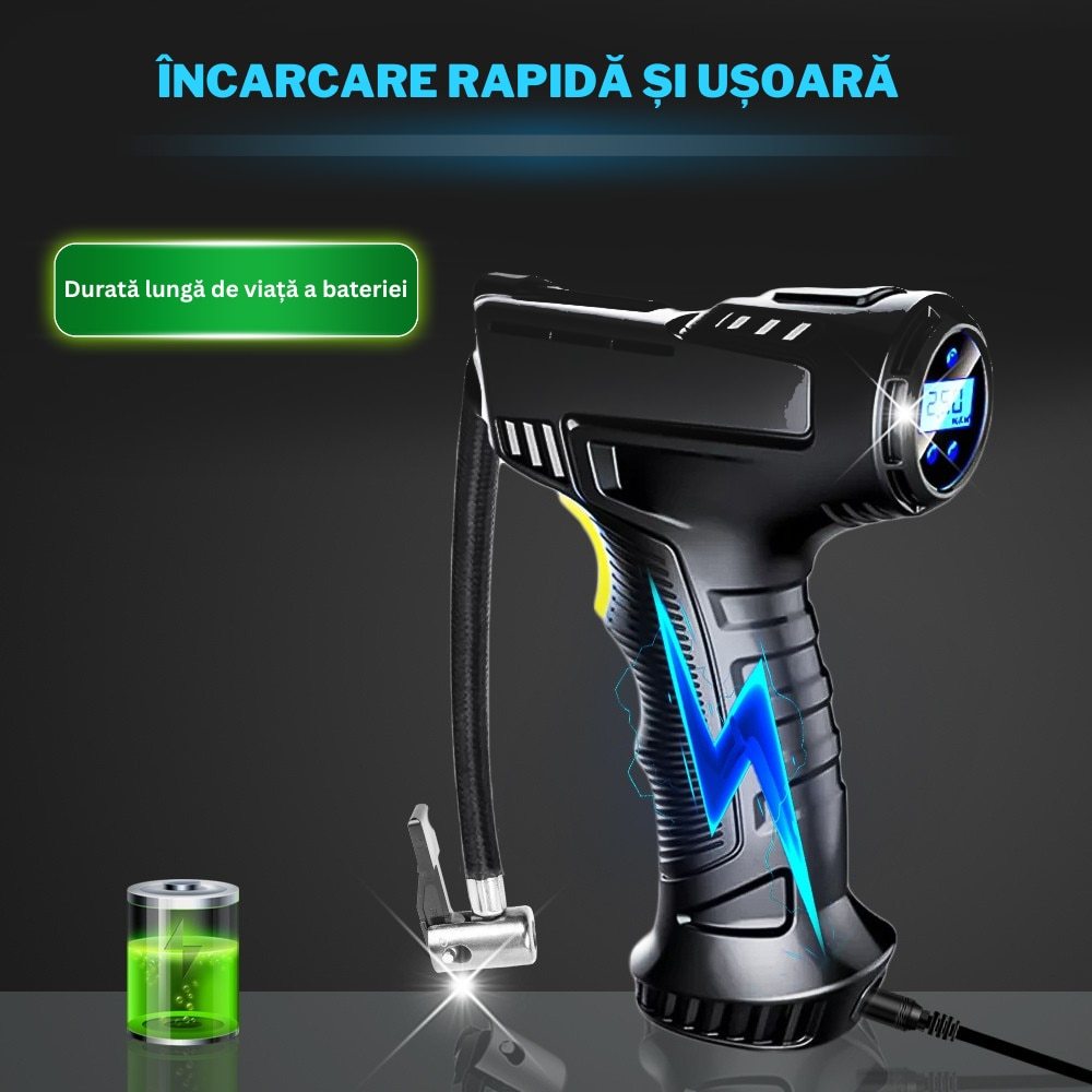 Pompare rapida: Capabilitatea de a umfla rapid rotile sau alte obiecte, cu o viteza de pompare de 20-35 L/min (aproape 10-15 minute pentru o roata auto complet goala, in functie de marimea acesteia).