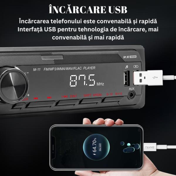 - Functia permite conectarea unei unitati USB (stick de memorie) pentru redarea fisierelor audio stocate pe aceasta. MP3 player-ul citeste fisierele direct de pe unitatea USB, oferind acces la o mare varietate de melodii fara a utiliza memoria interna.