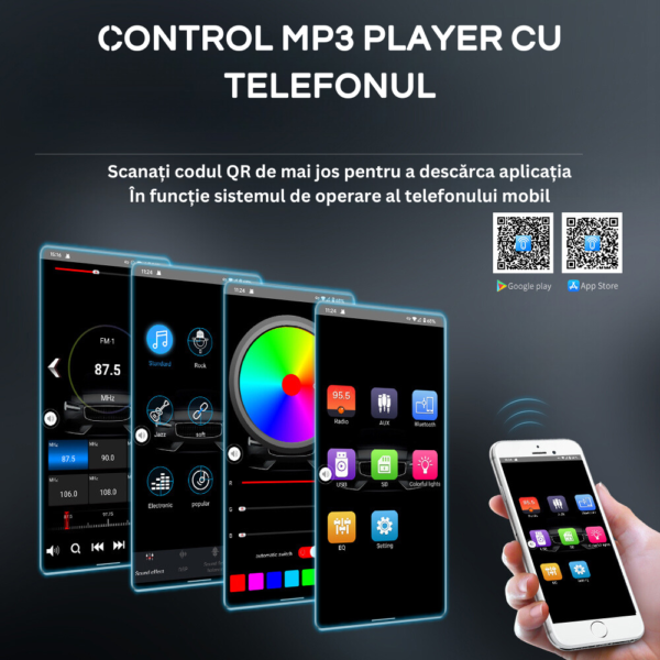Functia de control al MP3 player-ului cu telefonul permite utilizatorilor sa gestioneze si sa controleze redarea muzicii si setarile dispozitivului direct de pe smartphone, poti descarca aplicatia prin scanarea codului QR .