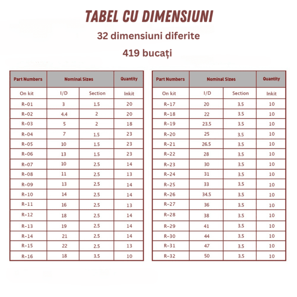 Set mixt 419 buc. O-ringuri / Garnituri din Cauciuc Nitril, 32 dimensiuni diferite, 3-50mm, pentru Reparatii auto, Hidraulice si Pneumatice, Organizate in Cutie