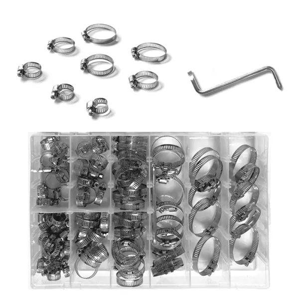 Set mixt 90 buc. cleme, coliere de furtun otel inoxidabil 8-38mm cu surub, Organizate in trusa semi-transparenta