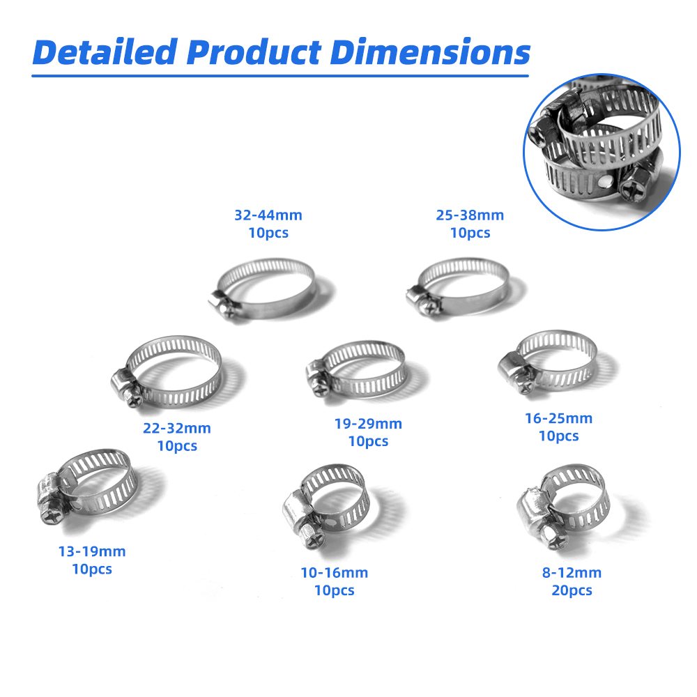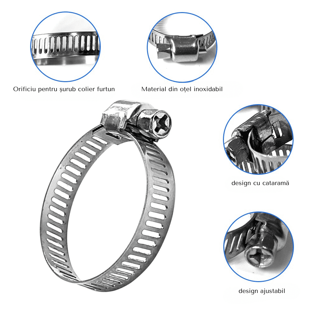Acest set de coliere pentru furtunuri este realizat din otel inoxidabil de inalta calitate, oferind rezistenta la coroziune, acizi si rugina. Sistemul de strangere reglabil permite ajustarea dimensiunii in functie de diametrul tevii, asigurand o fixare sigura si prevenind scurgerile de lichid.