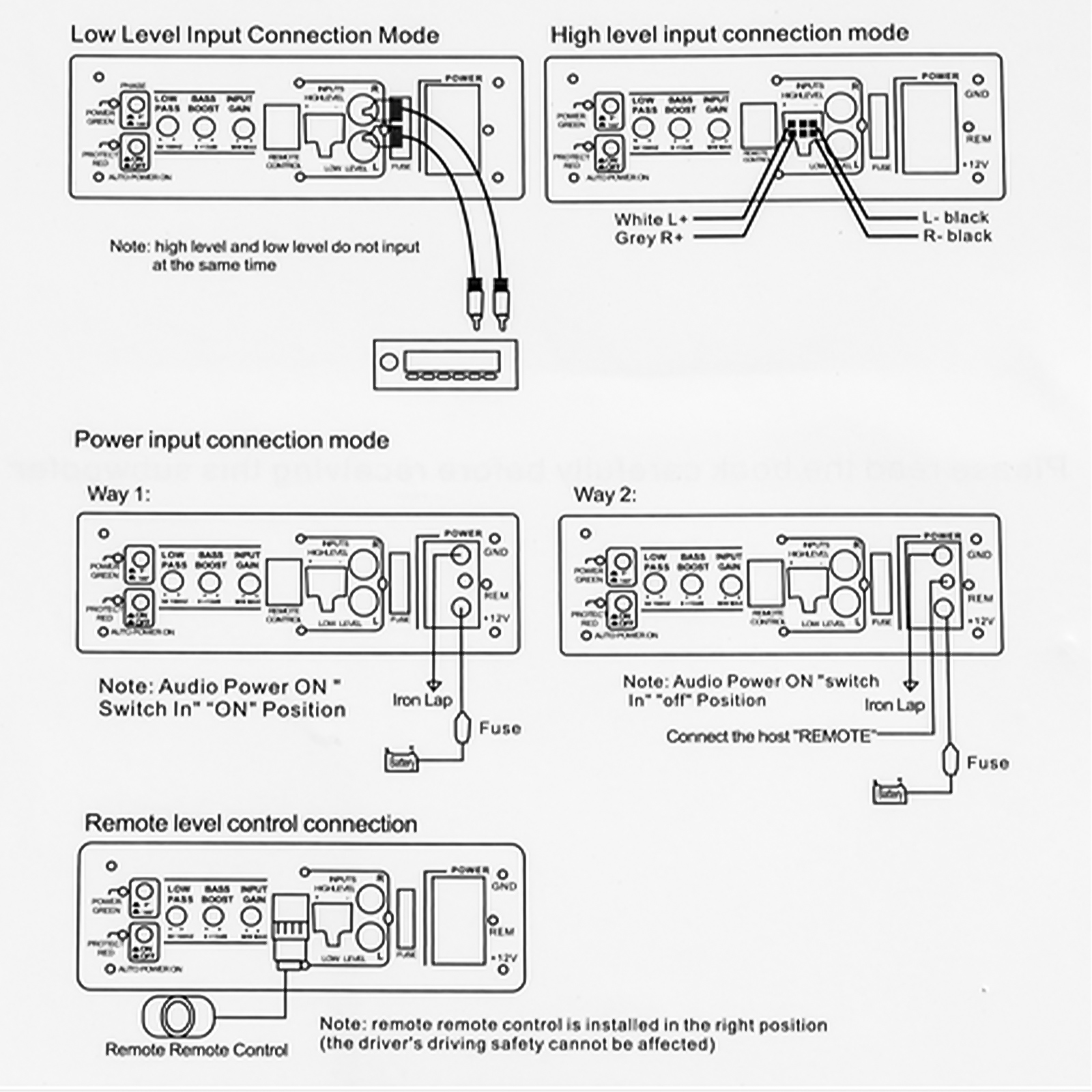 Folosit atunci cand nu exista iesiri RCA. Se conecteaza firele de semnal de la difuzoarele fata ale masinii in mufa „HIGH LEVEL INPUT”.