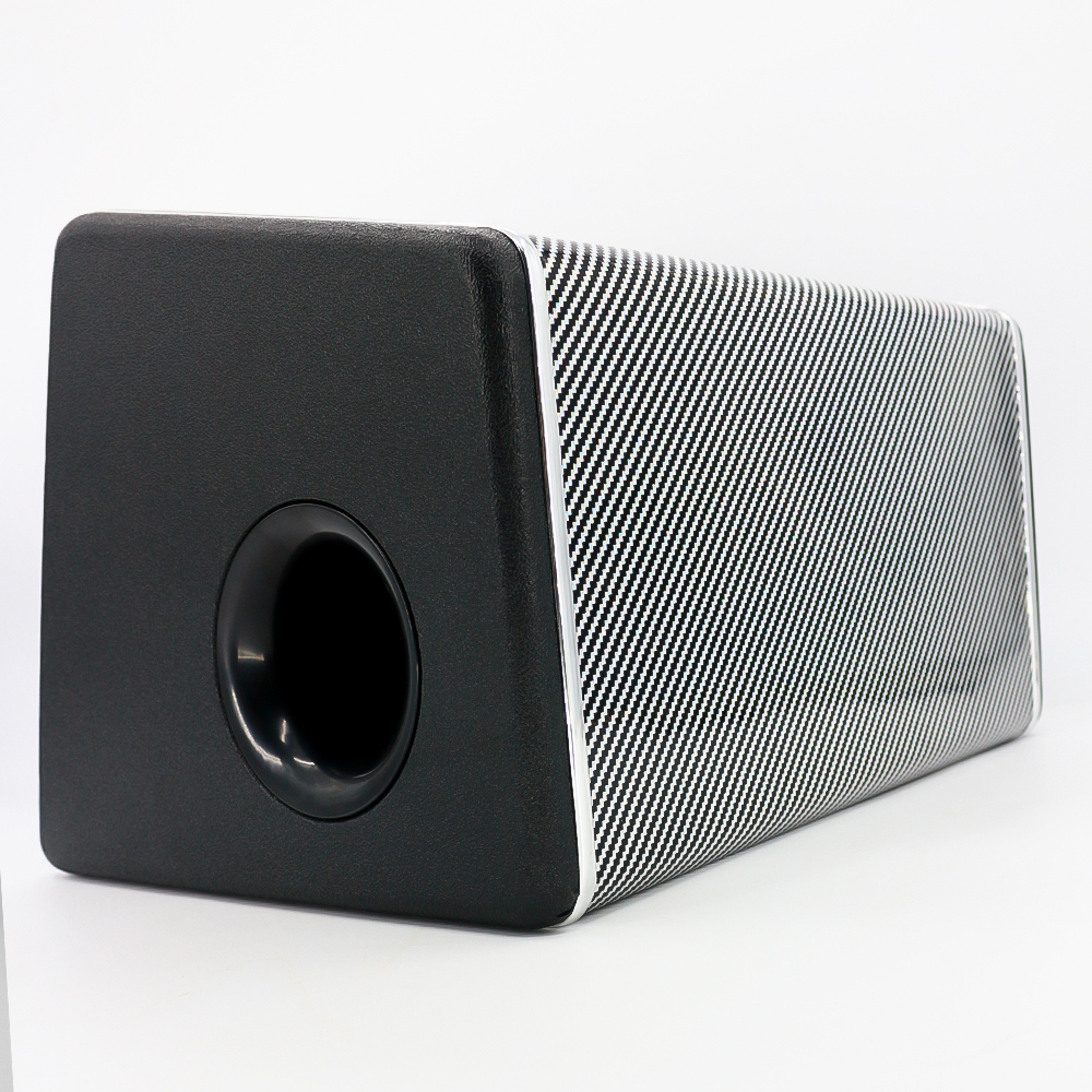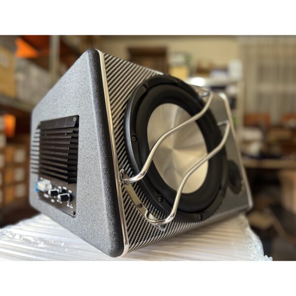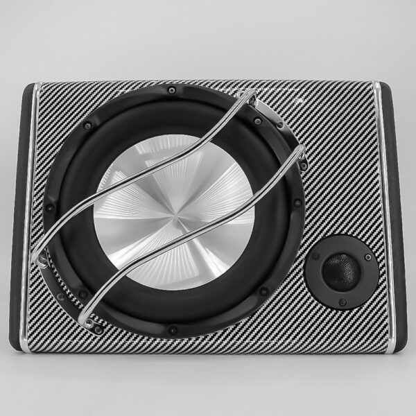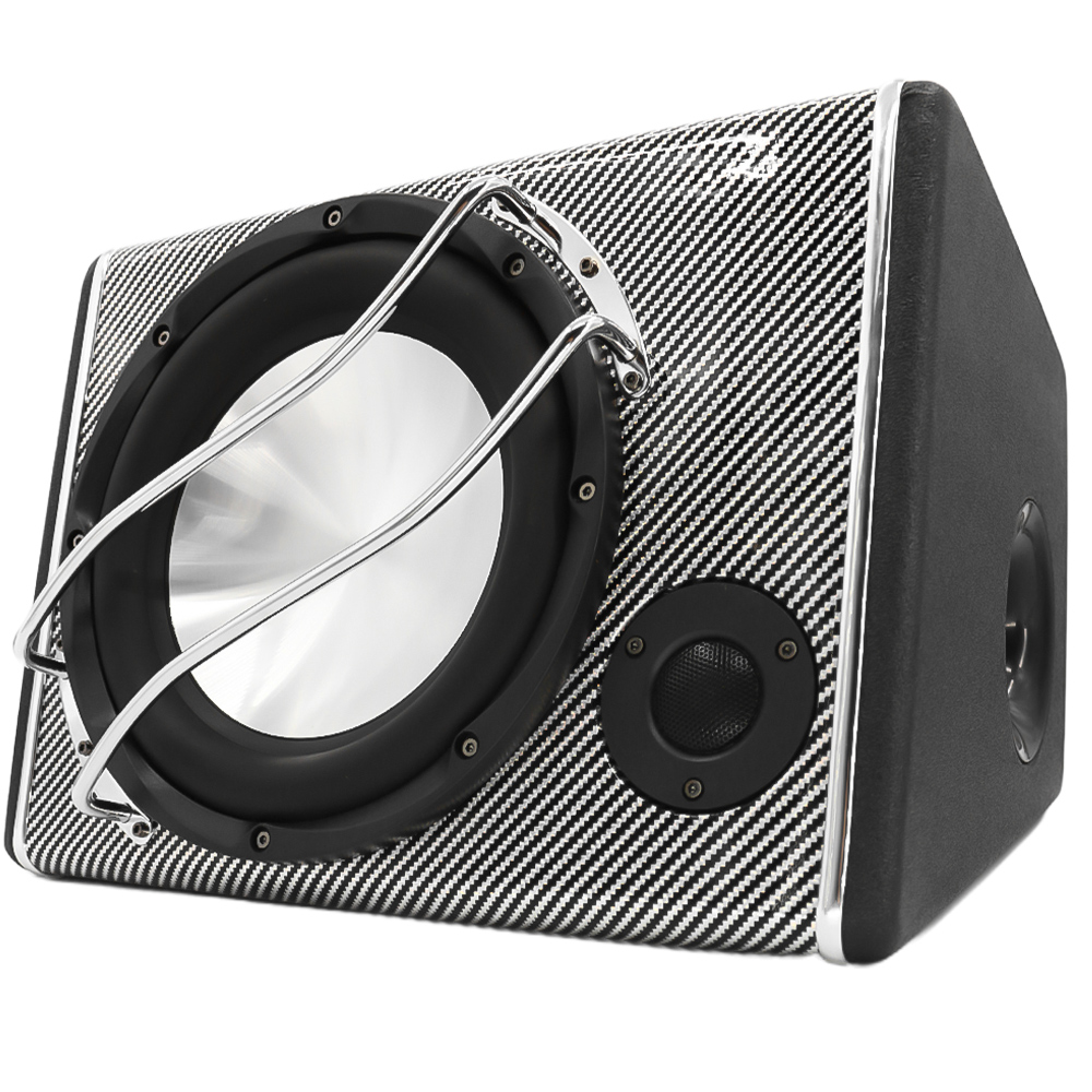 Carcasa compacta, cu design trapezoidal si finisaj din fibra de carbon, optimizeaza spatiul in portbagaj. Grila metalica frontala asigura protectia difuzorului in timpul transportului sau al utilizarii intense.