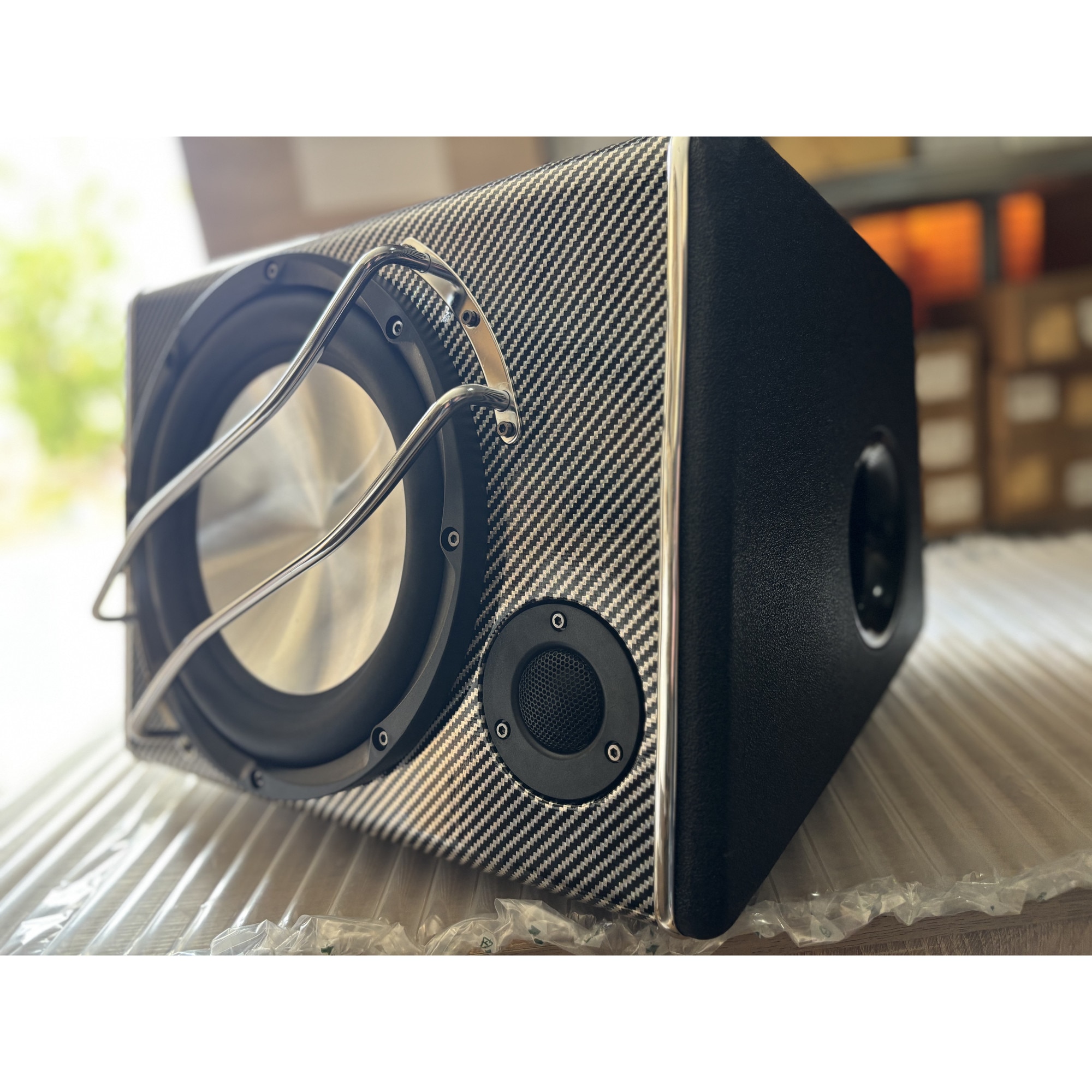 Carcasa compacta, cu design trapezoidal si finisaj din fibra de carbon, optimizeaza spatiul in portbagaj. Grila metalica frontala asigura protectia difuzorului in timpul transportului sau al utilizarii intense.