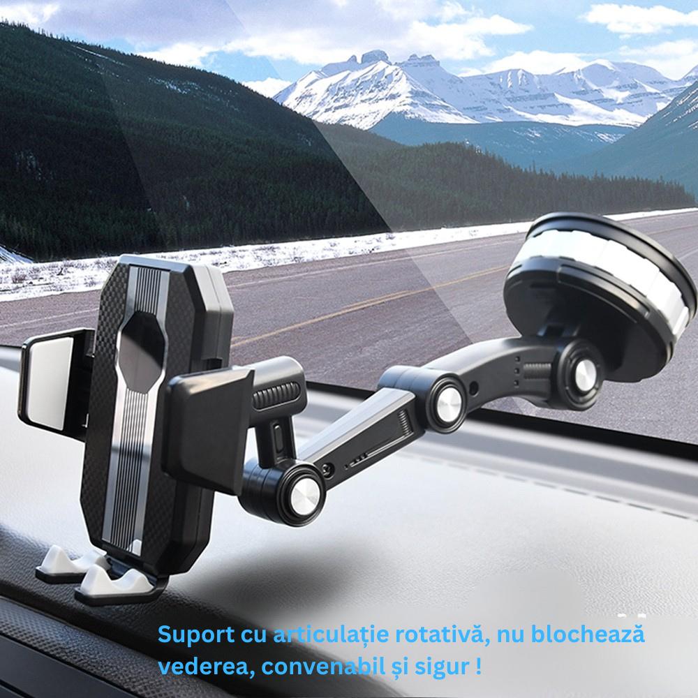 Suport Telefon Auto cu Brat Articulat si Ventuza Reutilizabila, MaxTech®, Reglaj in 3 puncte si Rotire 360°, Prindere Puternica pe Parbriz sau Bord, Compatibil Universal