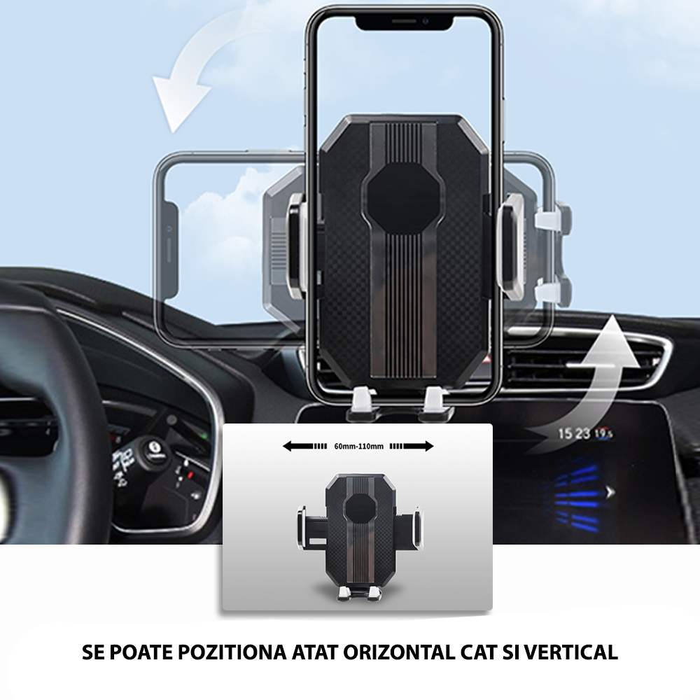 Montaj flexibil pentru telefon – Suportul permite rotirea telefonului la 360°, atat in pozitie verticala cat si orizontala, pentru un unghi de vizualizare optim. Potrivit pentru telefoane cu latime intre 60–110 mm.