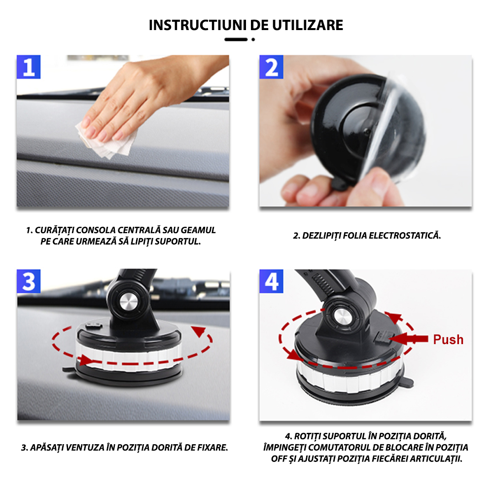 Instructiuni simple de montaj in 4 pasi: curata suprafata, dezlipeste folia, apasa ventuza pe pozitie si blocheaza suportul prin rotire. Fixare rapida si sigura, fara scule.