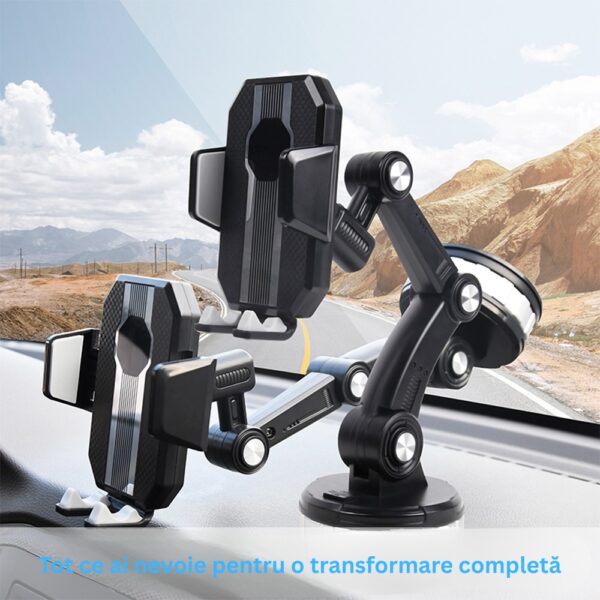 Brat extensibil cu articulatii multiple pentru ajustare perfecta – transformare completa a suportului pentru confort si vizibilitate optima in timpul condusului. Ideal pentru parbriz sau bord.