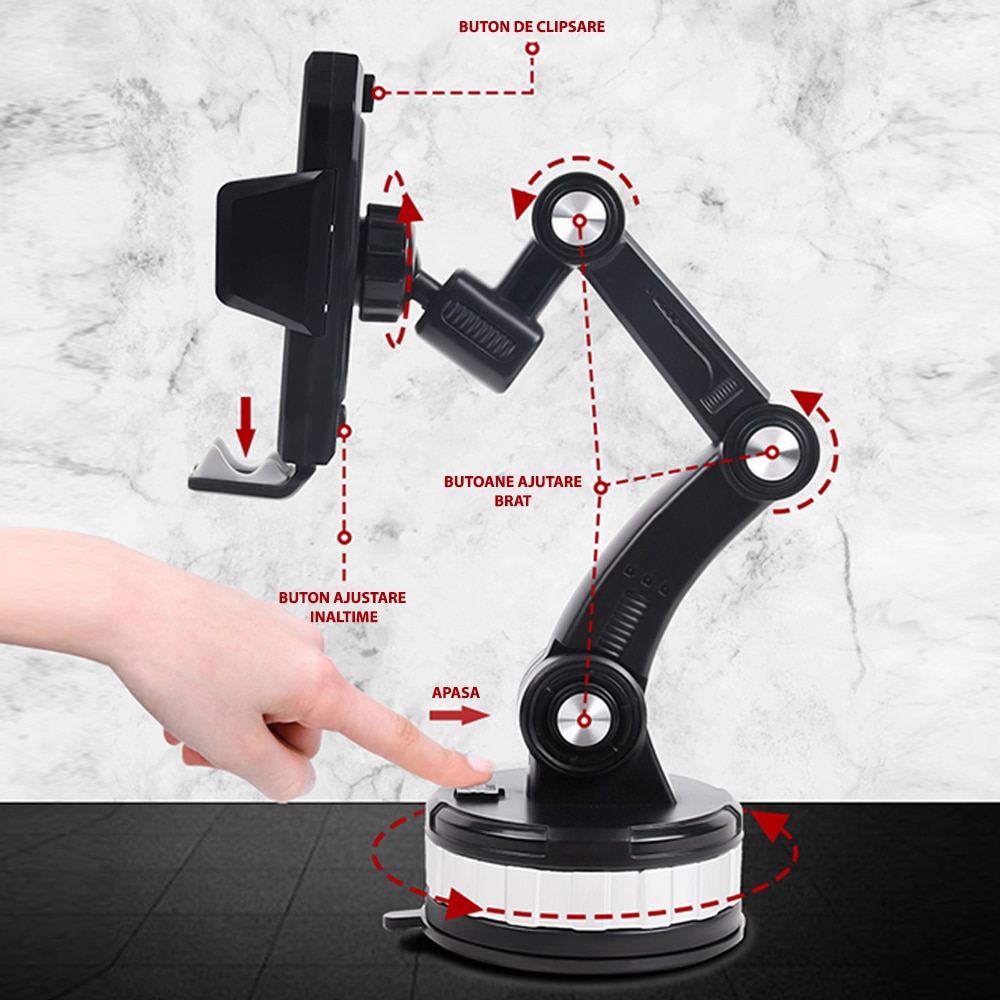 Brat extensibil cu articulatii multiple pentru ajustare perfecta – transformare completa a suportului pentru confort si vizibilitate optima in timpul condusului. Ideal pentru parbriz sau bord.