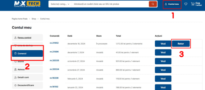 Produsele pot fi returnate în termen de 14 zile calendaristice de la primirea lor. Vom organiza ridicarea produsului de la adresa pe care o veți specifica, la o dată convenită de comun acord. Returul se efectuează direct din contul dumneavoastră, accesând secțiunea “Retur” (așa cum se poate observa în imaginile de mai jos). În cazul în care întâmpinați dificultăți, nu ezitați să ne contactați pentru asistență suplimentară.